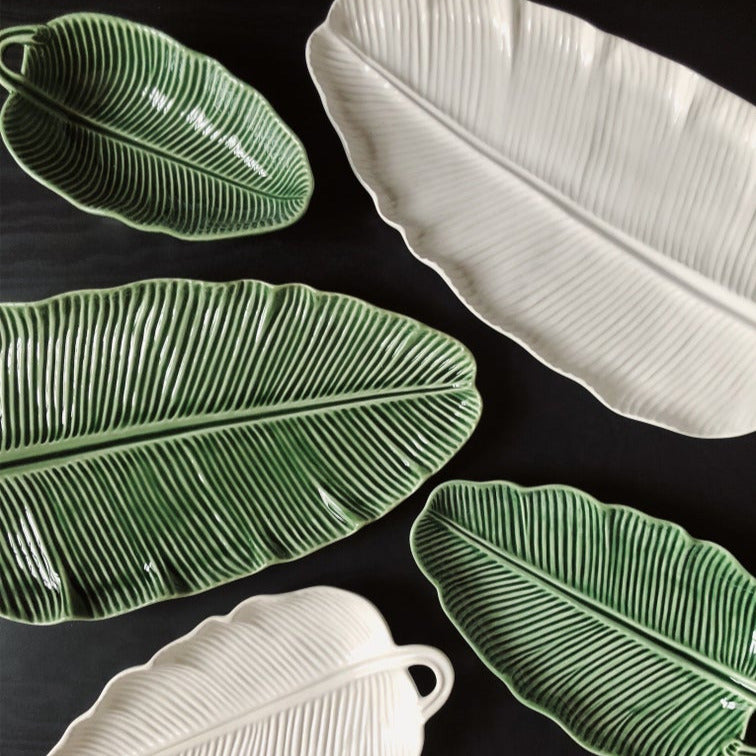 Raphael Bordallo Pinheiro was a Portuguese artist known for his illustrations, caricatures, sculptures, and ceramic designs. In 1884 he and his brother founded the ceramics factory Bordallo Pinheiro, in which his humorous and artistic designs were implemented with the characteristic, glazed ceramics from Portugal. Hundreds of ceramic models were created based on local traditions, using the fauna and flora as inspiration. The large ceramic plate from Bordallo Pinheiro in the shape of a banana leaf is one of the famous classics from Bordallo Pinheiro. It is suitable as a fruit plate or for serving dishes, as a cheese platter or simply as a decoration - also hung on the wall - a special object for a little more poetry and a touch of the south in everyday life.