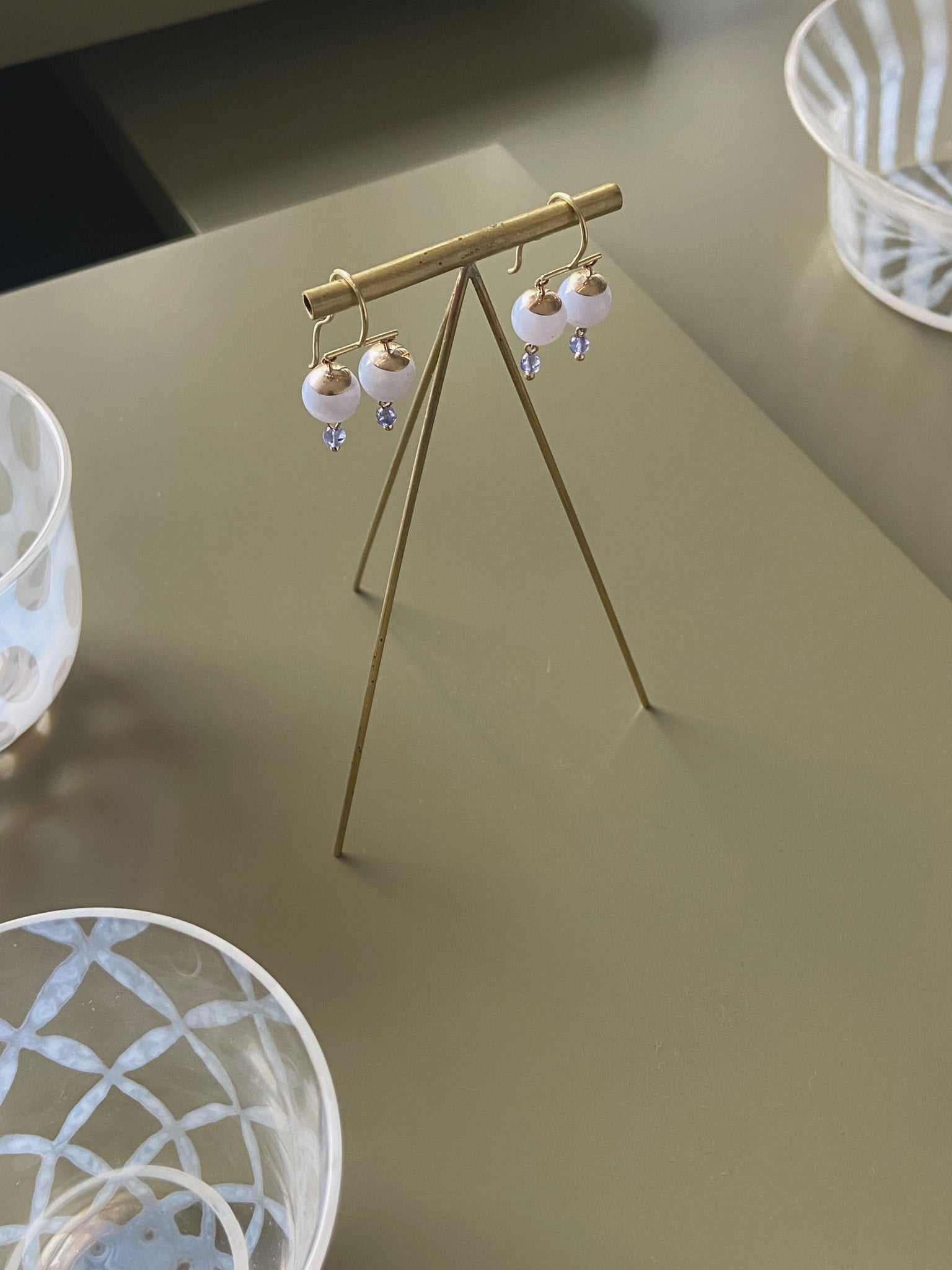 The 'Pomona' earrings balance two chalzedony beads and two purple-blue tanzanite beads on ear hooks made from 18k gold.
