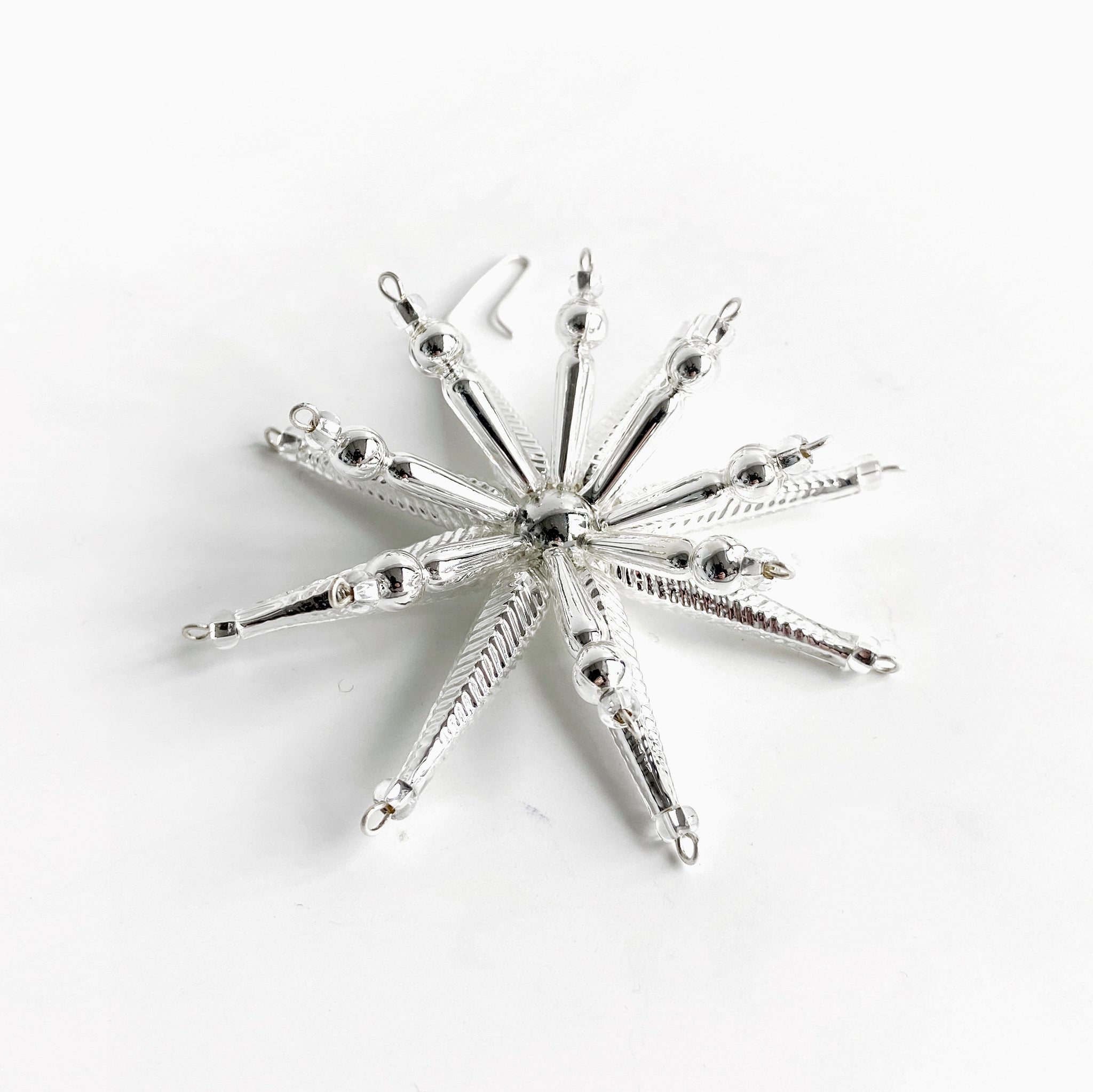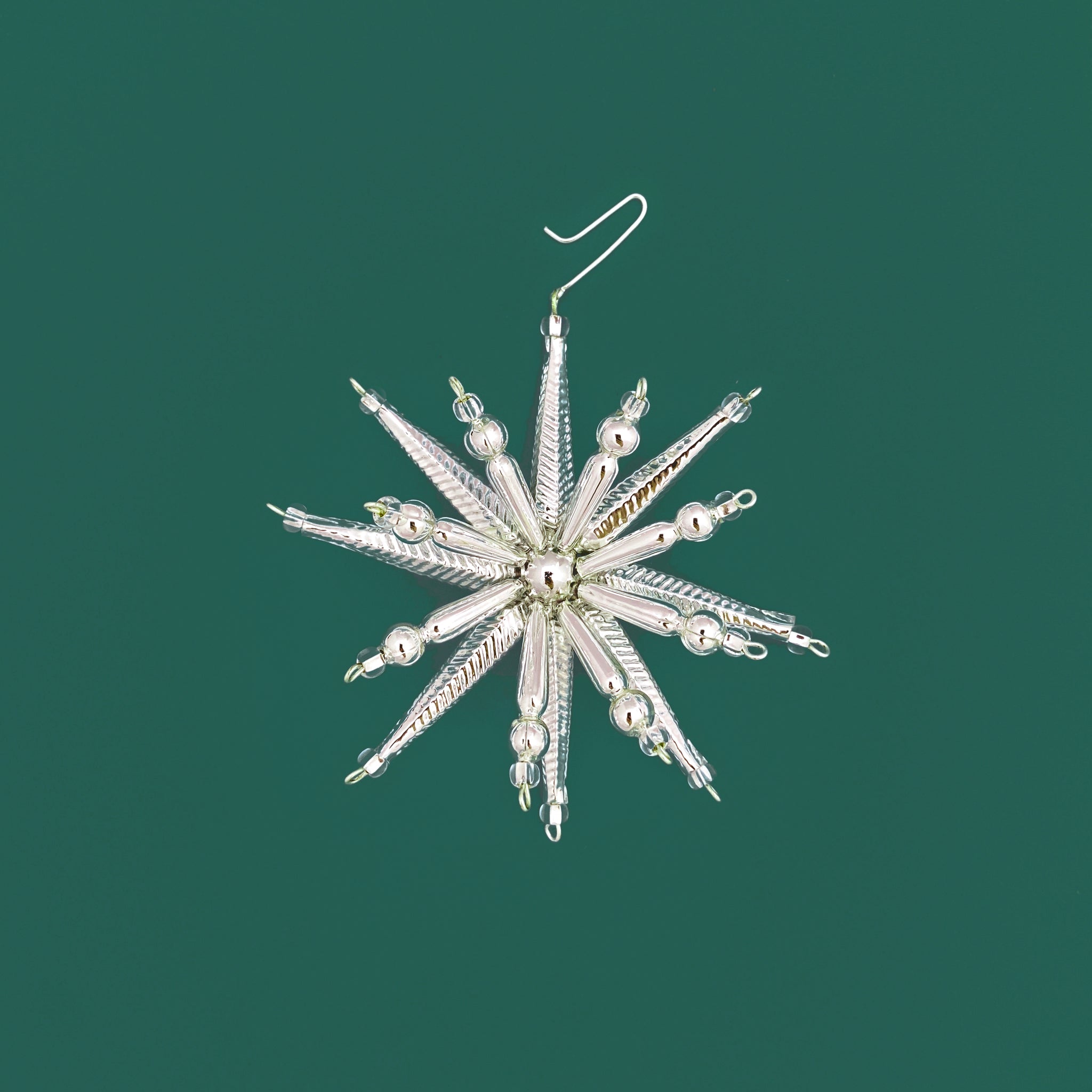 Böhmisches Glasperlen-Ornament Material: Mundgeblasene, versilberte Glasperlen, Draht Maße: 9 x 9 cm Handgefertigt. Alle Weihnachtsschmuckstücke und -artikel sind vom Umtausch und der Rückgabe ausgeschlossen. Hergestellt in Tschechien.