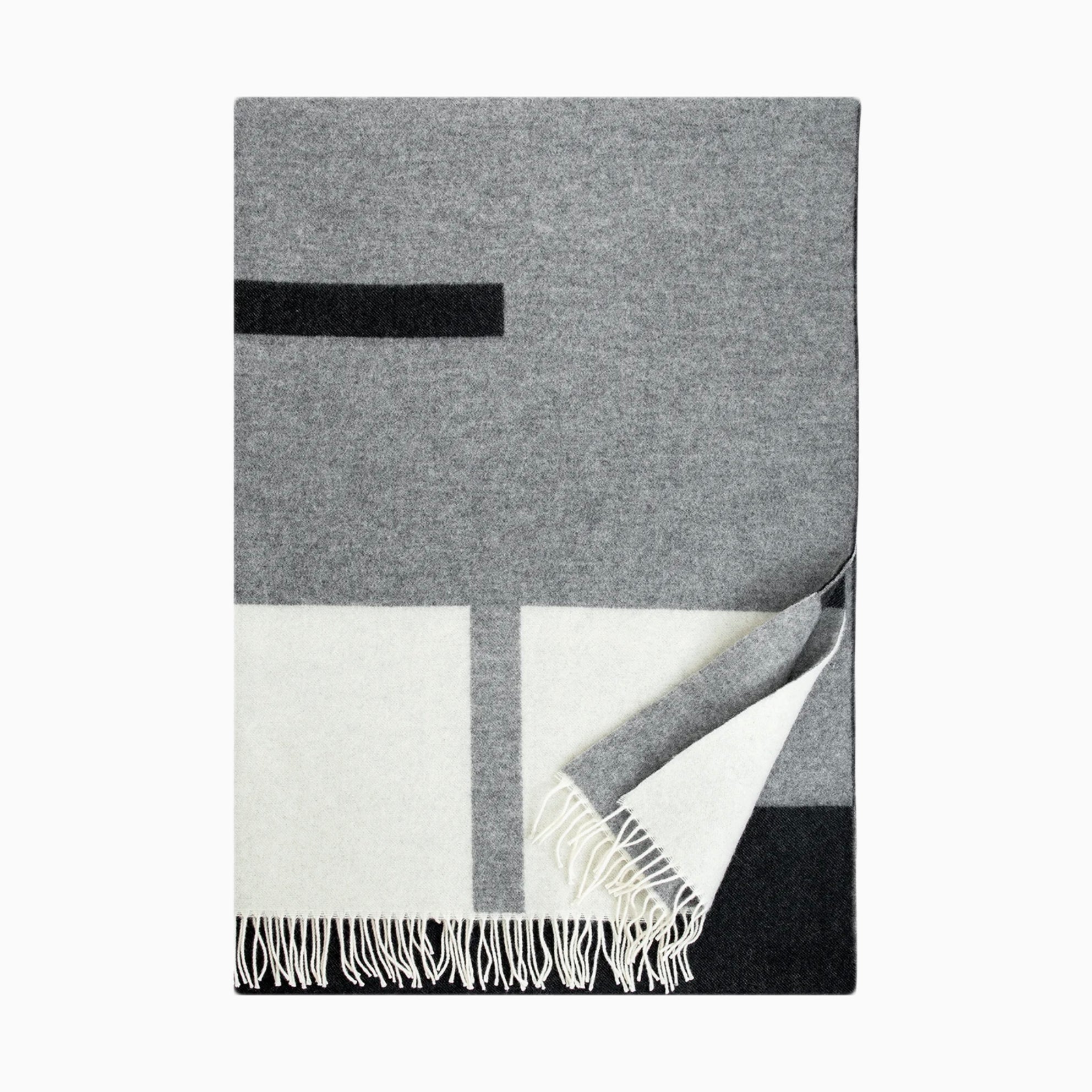 'Suunta' Wolldecke Maße: 130 x 180 cm + fringes Material: 100% Schurwolle Farbe: grau-weiß-schwarz Hergestellt in Finnland.