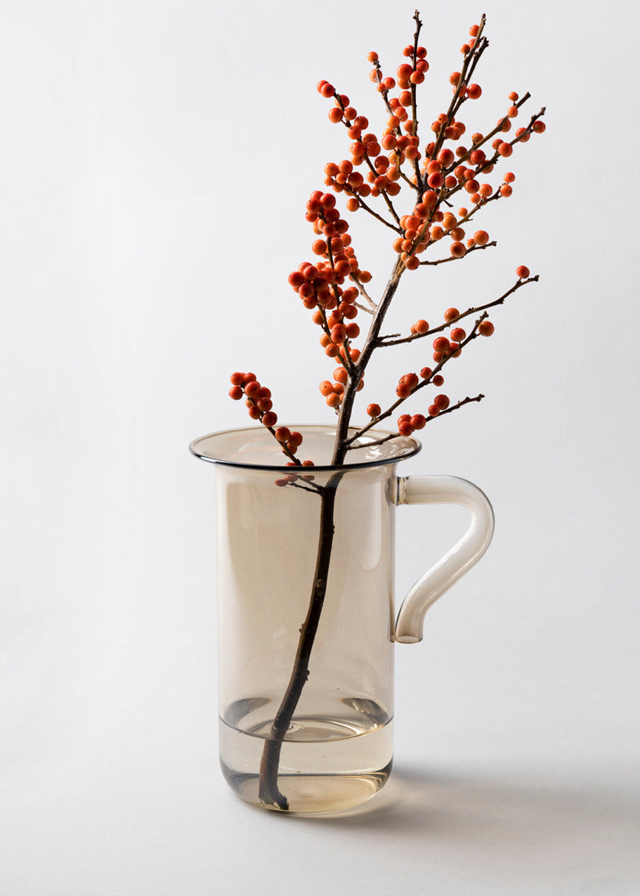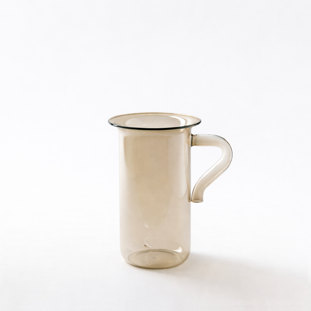 Die Glasgefäße der Serie 'Taverna' sind inspiriert von den Oinometras – den Aluminiumkannen, die in griechischen Tavernen zum festen Inventar gehören. Livia Lauber übersetzt diese vertrauten Alltagsobjekte in eine warme, zeitgemäße Formensprache aus Borosilikatglas. Handgefertigt und besonders hitze- und temperaturbeständig, eignet sich die Karaffe für Wasser, Wein, Tee oder Limonade. Mit ihrem Bronzeton funktioniert sie ebenso als Vase oder dekoratives Objekt und bringt eine leichte, mediterrane Atmosphäre auf Tisch und Fensterbank.